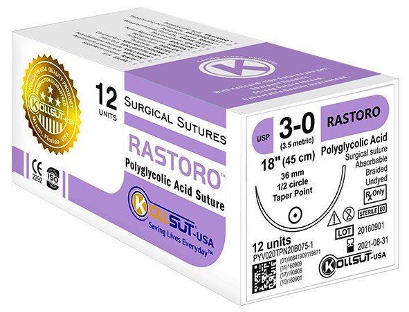 Rastoro™ Sutures (Polyglycolic Acid Sutures) Description: RASTORO™ (Polyglycolic Acid/PGA) is a synthetic absorbable braided suture coated with polycaprolactone and calcium stearate, have to be found to be inert, nonantigenic and nonpyrogenic Type of thread: Multifilament braided Reabsorption time: Reliable absorbability. Average 65% of the original tensile strength at 2 weeks. Predictable absorption (loss of mass) in 60 to 90 days. Benefits of the Suture: Excellent handling and knotting characteristics. Smooth tissue passage. Easy knotting and tie down. Excellent knot security. Thread color: RASTORO™ sutures are available in dyed (violet) and undyed form. Available thread sizes: USP 8/0 to 4 / Metric 0.4 to 6 Available length: From 150, 120, 100, 90, 80, 75, 70, 60, 50, 45 and 30 cm, with one or two or without needle, from one thread to 10 threads above. Type of final presentation: The envelopes containing the sutures are packaged in a duly identified and protected with a cardboard box laminating plastic thermocontractable. The quantity can be: 12, 24 or 36 envelopes in each box. Color of identification: Rastoro™ Sutures are identified by the Violet color (Pantone 2572C) in the label pack.
